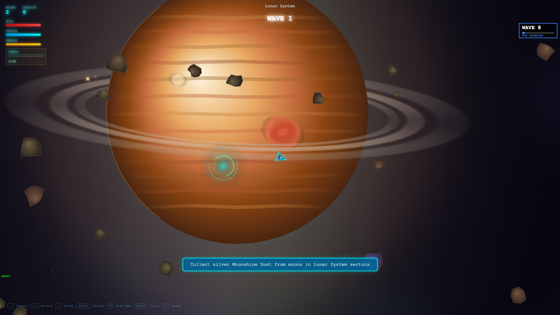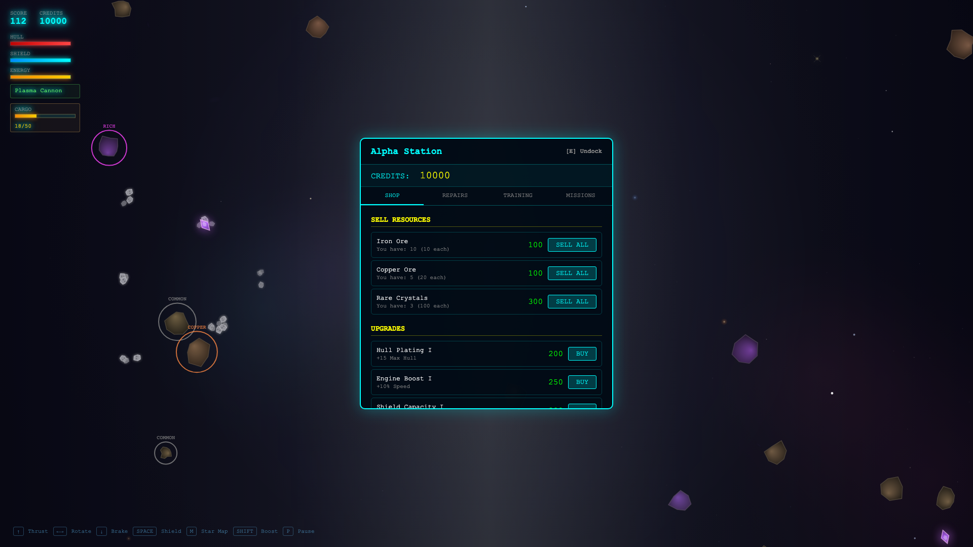 - Mining & Economy — Harvest ore, collect rare crystals, and trade at space stations to upgrade your ship's hull, shields, engines, and cargo capacity.